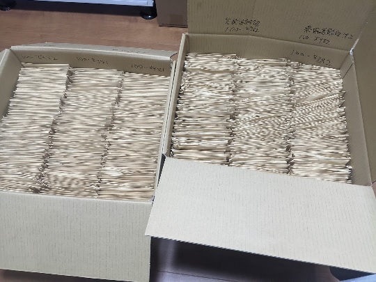 印刷したアンケート用紙の山。5000枚入りコピー用紙の箱使い切り