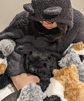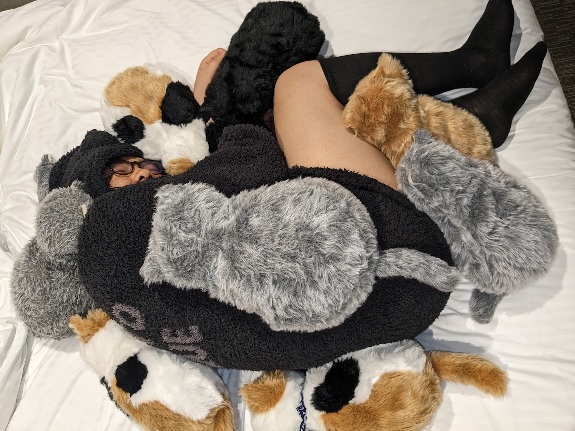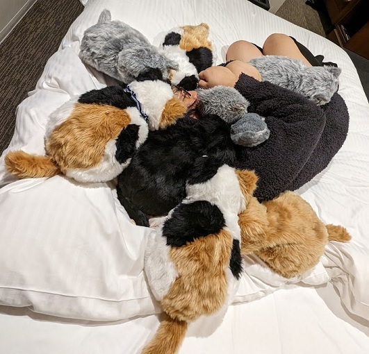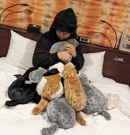 うちの子2匹と、ホテルの子6匹に囲まれる私