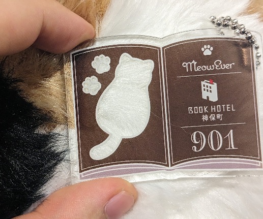 ミャウポーチの上に置いてあるアクリルキーホルダーは、 部屋ごと固有の宿泊者特典。右上はミャウエバー紹介カード。右下は一般宿泊者向けにフロントにいる三毛ミャウをなでなでできるチケット